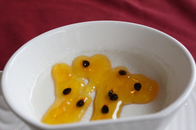 它的奶酪淋上醬料-百香果醬和薄薄的糖片覆蓋在其上,吃到的