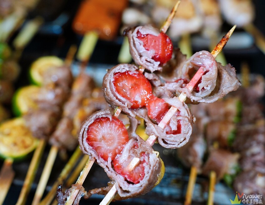▲這是季節限定的牛肉草莓串!想不到草莓也可以包到肉串裡面,草莓酸酸甜甜的口感,搭配牛肉串還蠻解膩的,不妨趁著草莓季來嚐鮮看看唷!