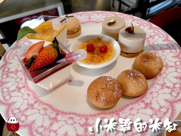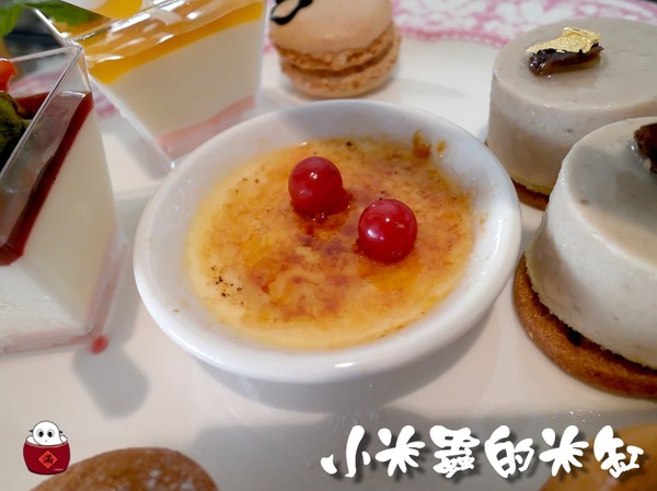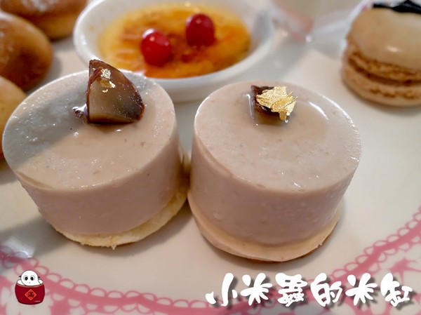 有覆盆子白巧克力慕斯、芒果白巧克力慕斯、杏仁焦糖蛋糕、栗子蛋糕、焦糖烤布蕾、馬卡龍
