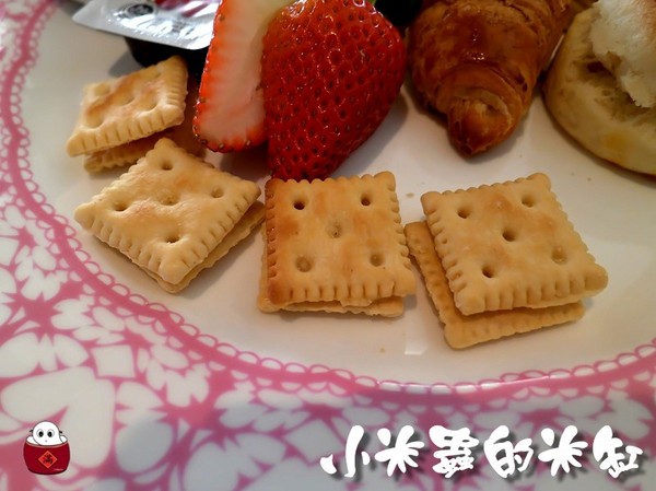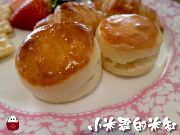 有原味司康、小可頌、乳酪夾心餅乾還有2個果醬跟一顆對半切的青澀草莓