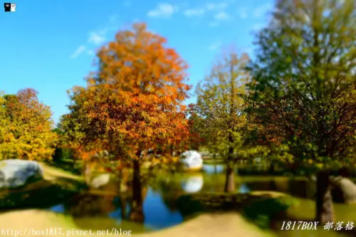 轉到園區的另一面,已有幾棵開始轉橘紅,周圍環繞閃耀波光的池面,水池裡還有養錦鯉魚及水蓮,加上藍天白雲的倒景,十分地好拍。