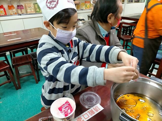 最後進行包裝作業,還可以在包裝袋上寫上名字、畫畫圖,完成自製的米粉袋。