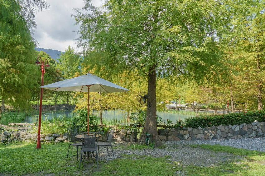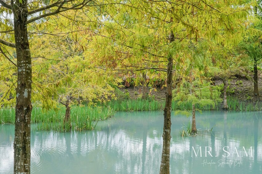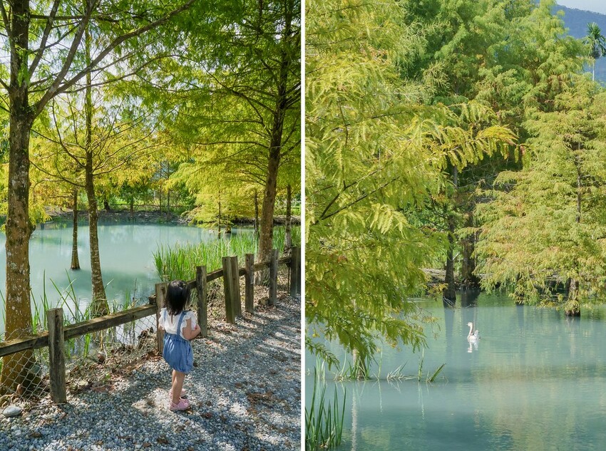 園區後方有自備停車場,從停車場走往咖啡廳的路上,映入眼簾的是一整片的落羽松美景,淺水池中打造出如此夢幻美景,這個水池的顏色並非後製而來,而是真實的Tiffany Blue,隨著季節逐漸轉黃的落羽松,搭配著山稜線上的藍天白雲,小鴨正在水面上滑行,景色是如此的珍貴,太漂亮了!