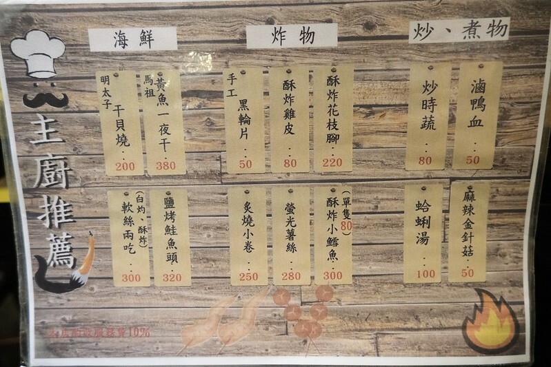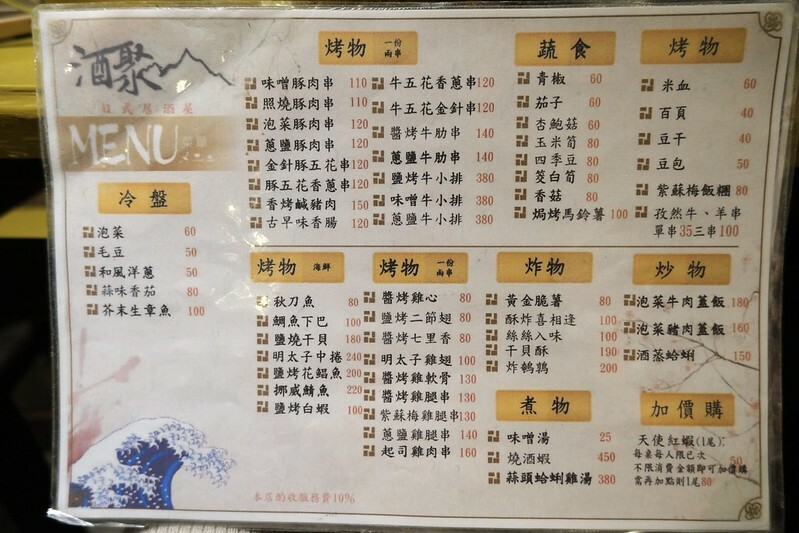 酒聚提供的餐點非常豐富,除了多種烤串及炸物,還有炒物、冷盤、海鮮、酒類和主廚特色料理,價位也不算太貴,烤串大約在$110~$380左右,CP值很高,上google五星評論還會送一份手工黑輪片喔!