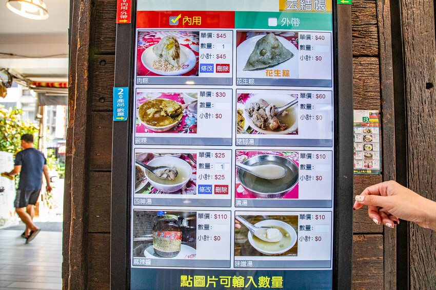 肉粽泰Tai是用點餐機點餐,有碗粿、肉粽、土豆粽、豬腳湯、四神湯、味噌湯等等,點完餐後機器會出一張紙,上面會有你點的餐點種類跟數量,接著就拿著你的單子去櫃檯找店員交給他取餐,其實很簡單,連小朋友都會點