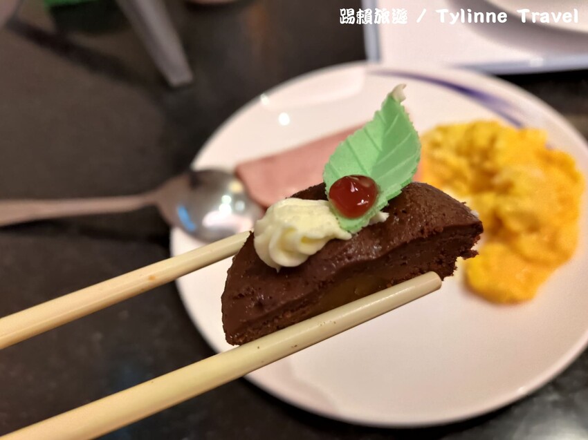 甜點的說明牌上寫「精緻甜點」,實際上的樣子真的滿精緻的,下面蛋糕的部分非常紮實,一口咬下份量十足