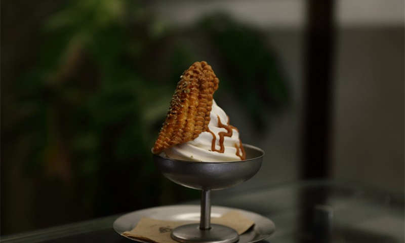 不僅如此,霜淇淋內還添加了玉米脆片,這不僅增加了口感的層次,還在每一口中帶來獨特的玉米風味。整體而言,這道甜點以甜鹹交錯的口味,展現了出色的創意和烹飪技巧,絕對是一道值得一試的特色甜品。