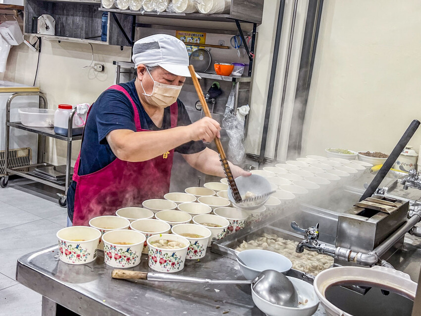 門口處左邊是櫃台,右邊是料理區,後方可以看到很多店員在包餛鈍,煮餛飩的檯面放了滿滿三排紙碗,煮好的餛飩就直接放進只往加湯就可以上桌了,一次煮餛飩的量有夠驚人,滿滿的跟小山似的