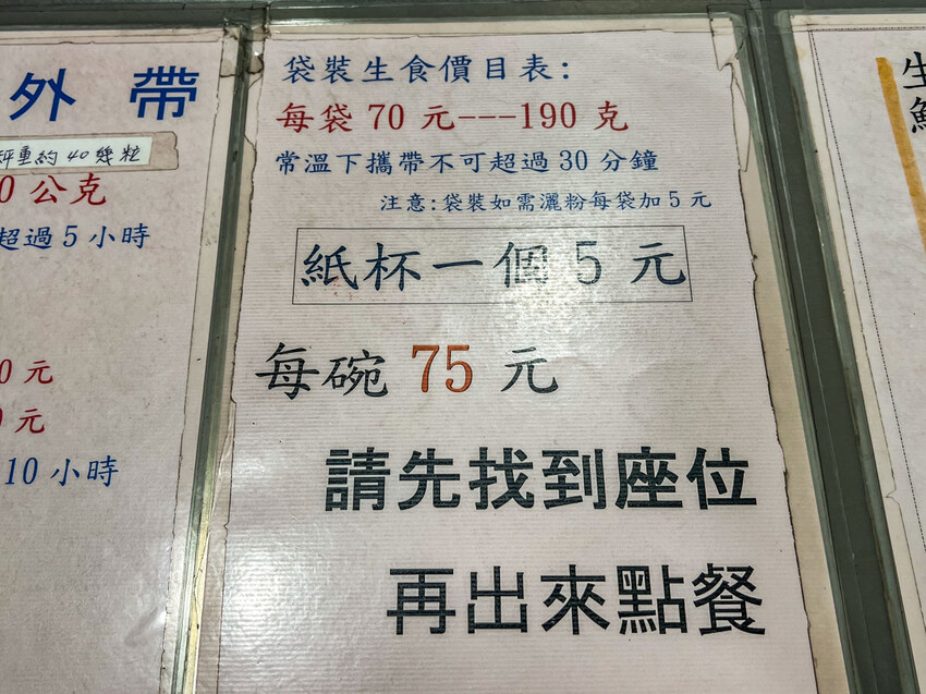 就賣一樣扁食,沒得選,一碗75元,然後也有賣聲的可以回家自己煮,但常溫禮盒裝不能超過五個小時,袋裝不能超過30分鐘,不然餛飩會黏黏在一起