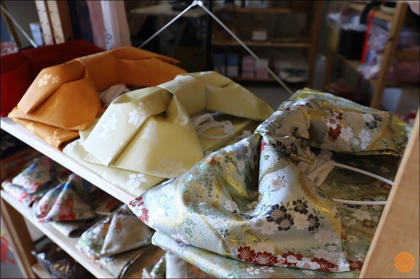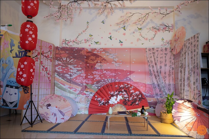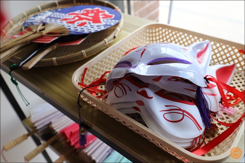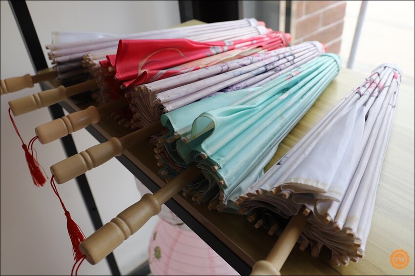 除了有日式浴服及中式漢服之外,入口處有個置物架,上面則是有各式各樣搭配的道具小物,有多款面具、漂亮的紙扇、油紙傘…..等。