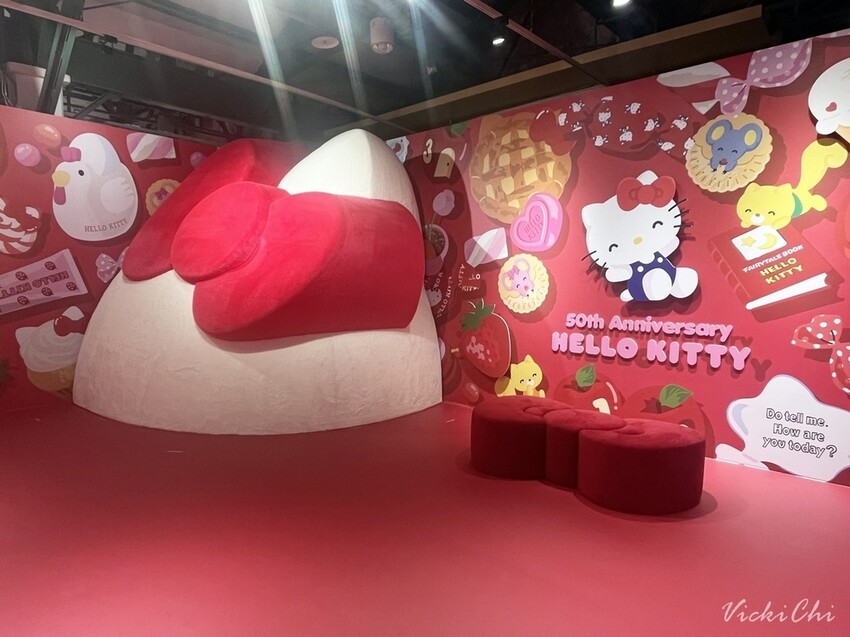 展覽必拍留念的「50週年紀念區」,打破場地限制,直接貫穿展館一、二樓的空間,超巨型50週年「HELLO KITTY」Logo。
