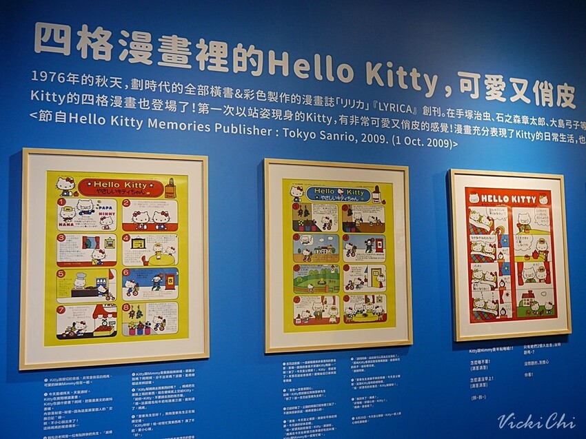 一大面的HELLO KITTY穿著經典的藍色吊帶褲,旁邊有他的基本資料,寫著身高5個蘋果高、體重3個蘋果重,有個雙胞胎妹妹Mimmy。另外一邊則是介紹HELLO KITTY家人和朋友。