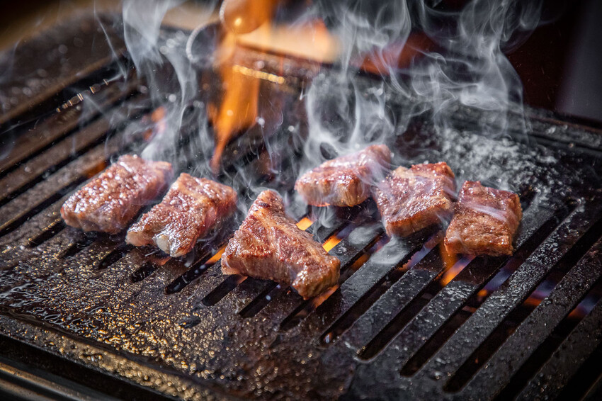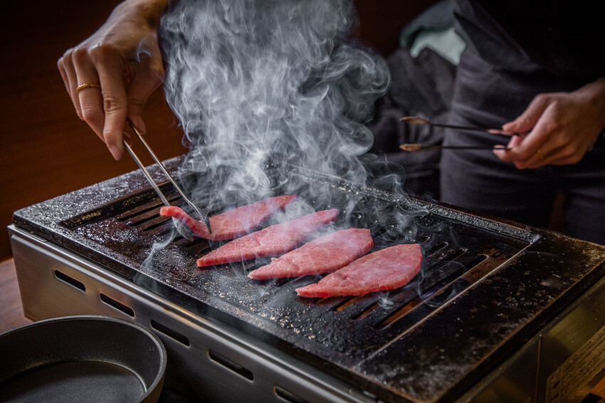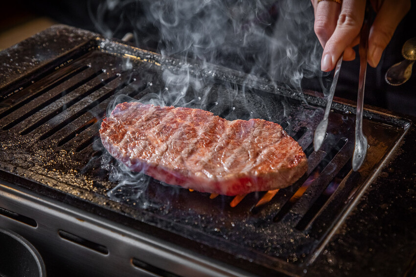 燒烤的順序也是從油花少的開始烤,所以第一烤就是菲力啦,雖然說菲力的油脂比較少,但畢竟它是和牛A5等級,一放上去還是會有火花,油脂香氣隨即飄散,油花細膩、肌理細緻 · 可以感受和牛瘦肉的高雅香氣及淡雅的油脂香
