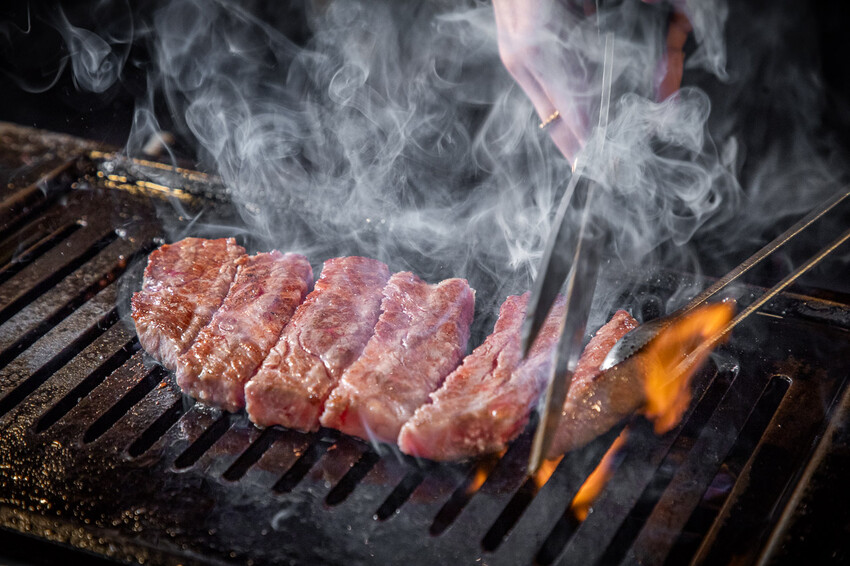 開烤!藏王極上燒肉餐酒館是全程桌邊服務,店員們都受過專業的訓練,顧客只要出一張嘴等吃就好!而且不是使用一般的鐵網炭爐而是特製的鑄鐵烤盤,烤之前會先用牛油刷過預熱