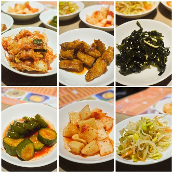 六樣道地的韓國小菜,有韓式泡菜、老闆娘用韓國空運來台的特製辣粉調味而成小黃瓜及醃蘿蔔,