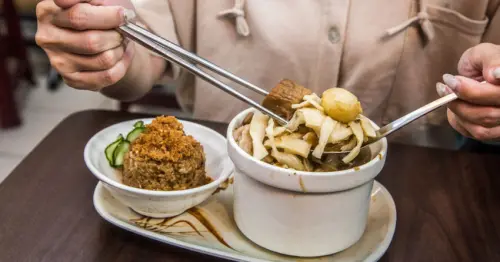 米飯吃起來相當的Q彈不黏牙,香菇的甜味結合豬梅花肉的彈性,增添油脂與咀嚼口感。