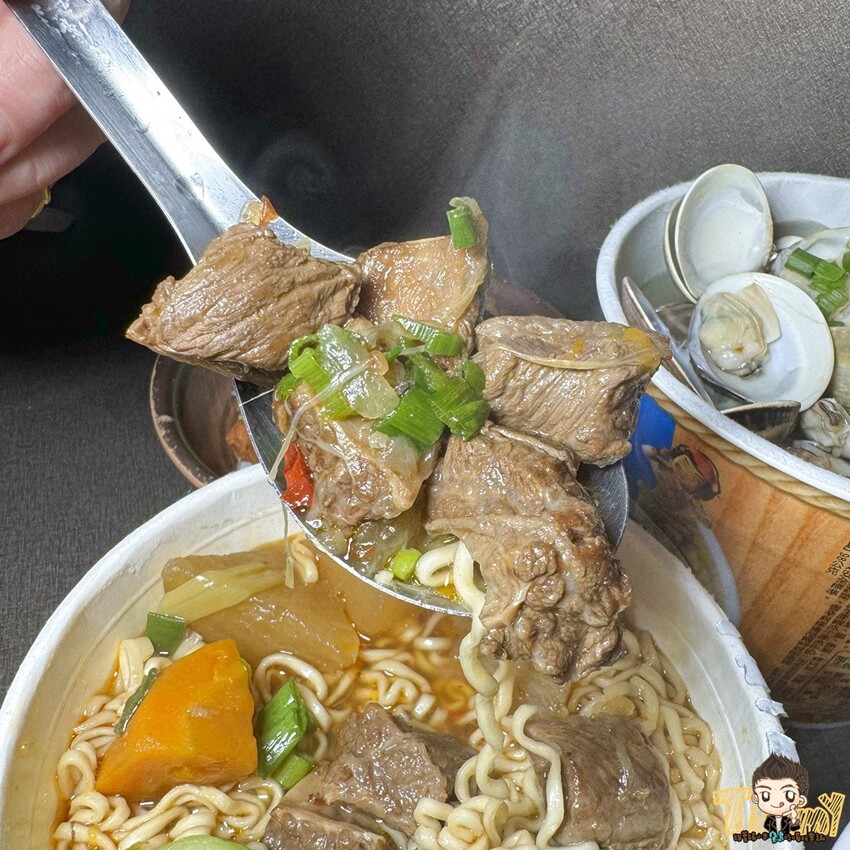 湯頭使用的是紅燒牛大骨湯,喝起來順口甜美,跟泡麵湯完全不一樣。