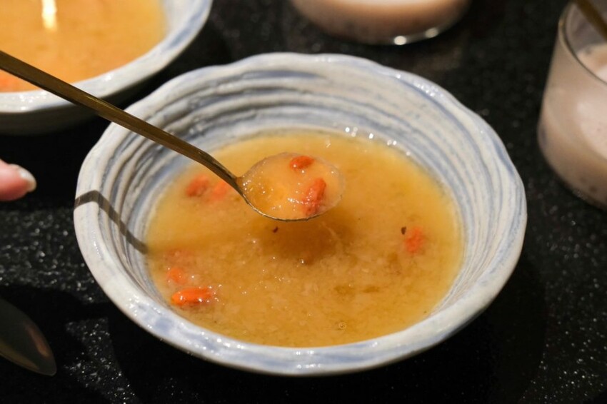 ▼甜點這次吃到紅豆紫米湯和桃膠銀耳湯,大力推薦這碗桃膠銀耳湯,每一匙都很真材實料,質地濃稠溫潤感,富有膠質及豐富口感!