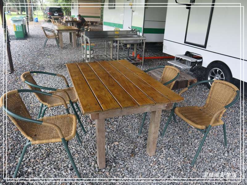 我們E區的露營車可以直接停帳邊,上頭一樣有大雨棚遮檔,而門口還附一桌四椅可供炊食,整個就是方便。