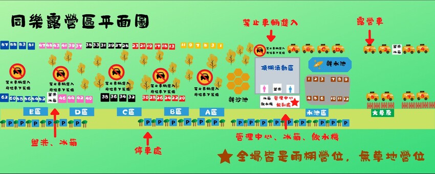 截取自官網的平面圖,整個營區蠻大的哦!從最外頭的入口到最裡頭的E區還有一段距離,是屬於長條型的地型。