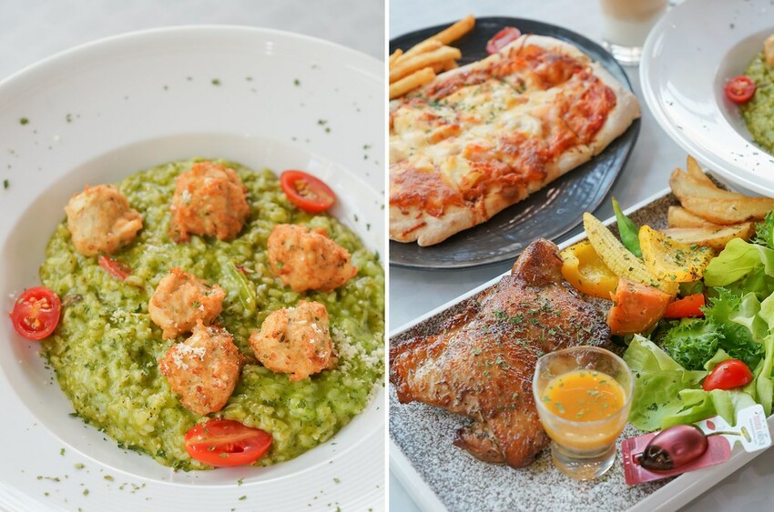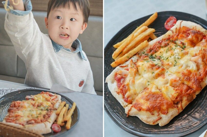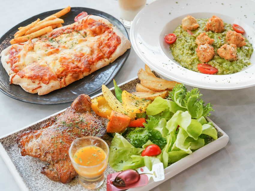 帶著孩子前往的我們,選擇了適合孩子們用餐的餐點,較為好咀嚼的青醬燉飯,帶有嚼勁的米粒包覆醬汁,九層塔羅勒的香氣扎實地融入燉飯中,對於孩子們品嚐剛剛好。而不敗選擇pizza,上層鋪蓋的魷魚及蝦子,增添了不少披薩豐富的口感。而鮮嫩多汁的雞腿,則是食肉先森的最愛,一整隻雞腿淋上桔醬,添入的桔子香氣更是恰到好處。
