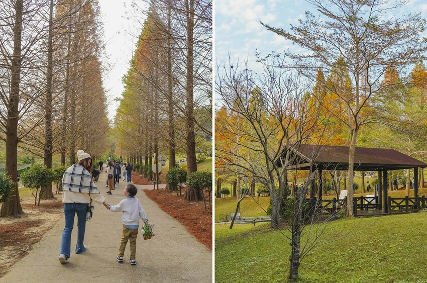 小森之歌最著名的就是其高聳天際的兩側落羽松大道,打從大門走入就可以看到這個美景,每個前來的旅客都忍不住拿起手機拍攝,1月初前往的時候,有點可惜枝末的部分已經落葉,但樹頂部分茂密的橘紅樹葉還是如此的迷人!