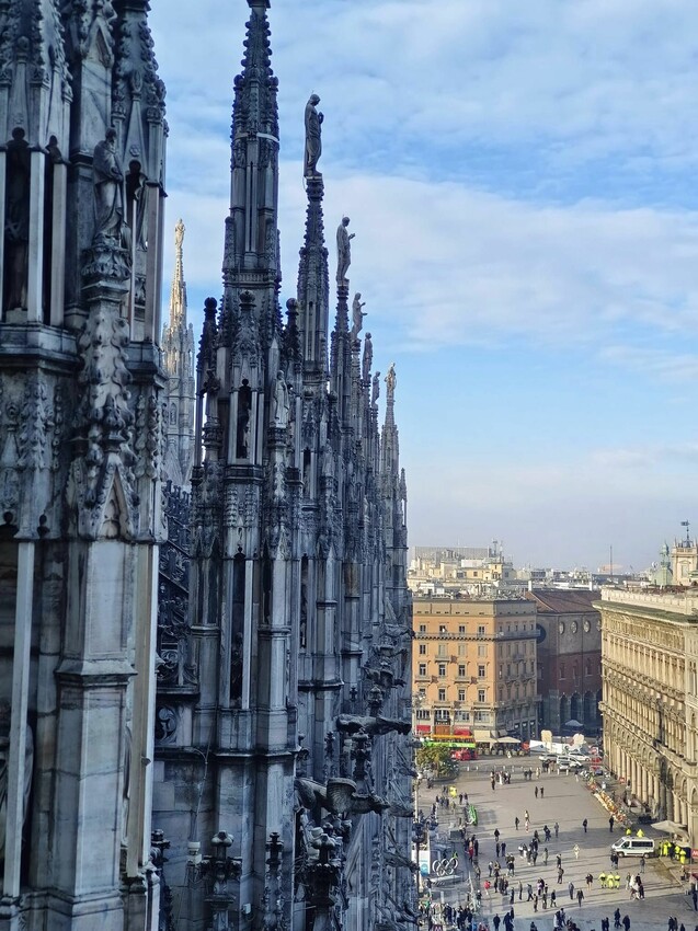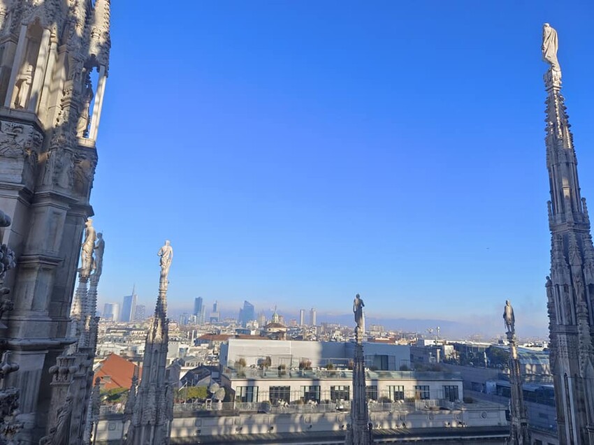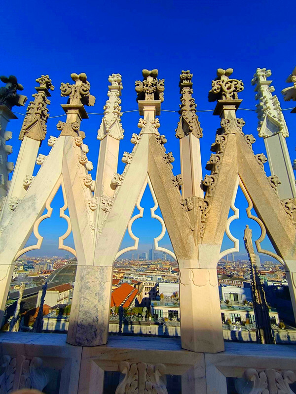 還能從教堂屋頂上遠眺米蘭市區的景色,每一尊尖塔上都站了不同的聖人雕像