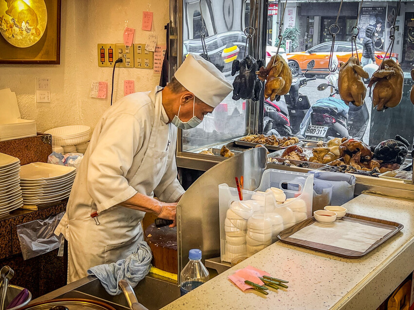 一進門口右手邊有一個大叔在剁雞,櫥窗裡掛著三種顏色的雞,也是雞家莊的招牌三味雞
