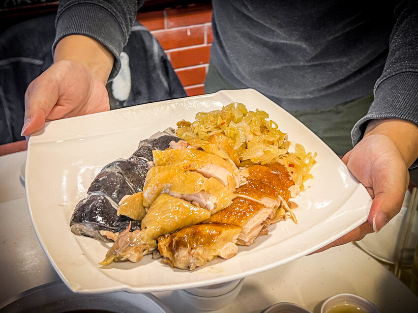三色雞,雞家莊的招牌之一,一盤裡有三種風味的雞肉,在樓下光是看櫥窗的油雞就覺得超誘人,本來想說切烏骨雞而已,但想想來都來了,吃不完打包就好了,雞肉肉質很軟嫩,雞皮的香氣很明顯,吃起來帶有鹹香跟滑嫩的口感,附上的醬汁也棒,讓雞肉吃起來更有味道