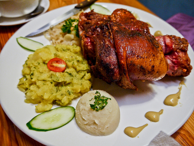 有沙拉和馬鈴薯泥。香腸有兩隻,一隻傳統一隻辣味