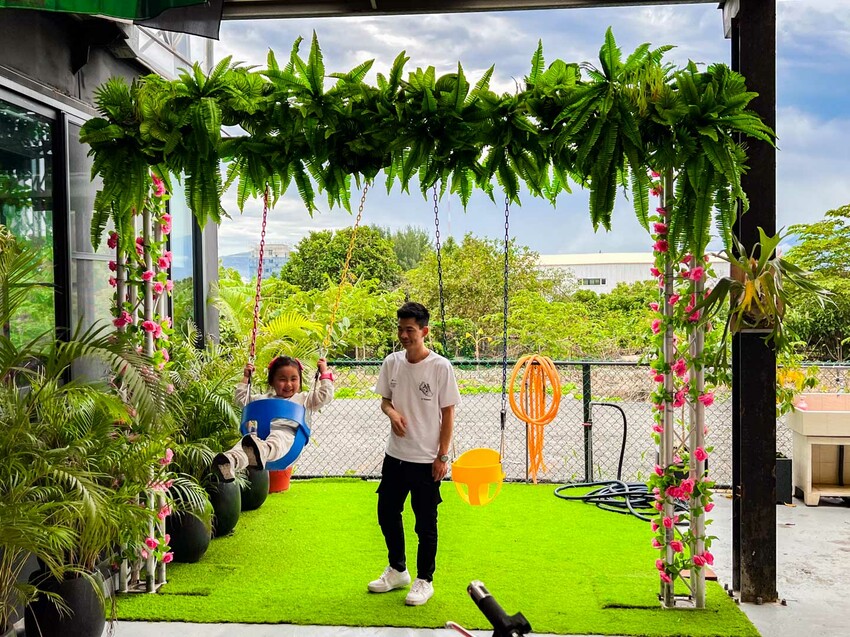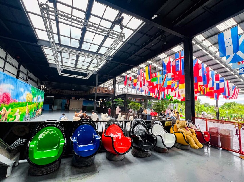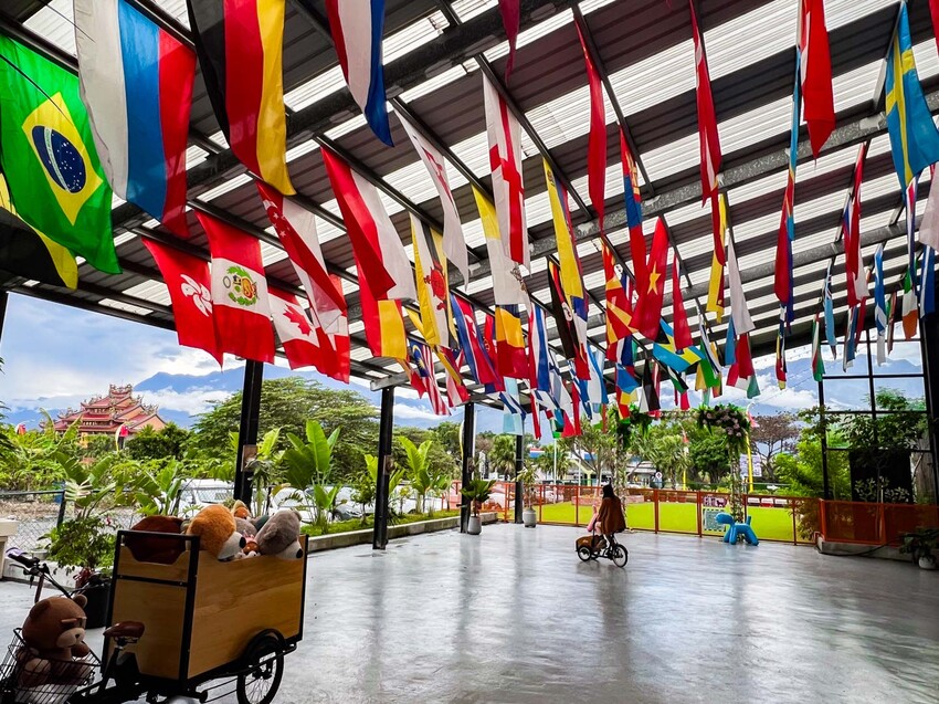 走進汪woof cafe,空間非常寬敞舒適,屋頂上還掛了各國的國旗,聽說老闆為了開這間寵物餐廳,去很多國家考察其他寵物餐廳的經營模式,全開放式的空間非常乾淨,完全沒有狗味或是其他異味,餐廳還有佈置可愛的拍照裝置跟盪鞦韆可以給小朋友玩