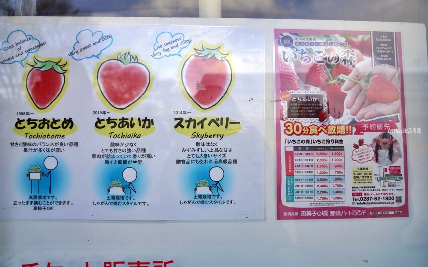 栃木縣的草莓又很有名,行程剛好會路過,當然安排來那須高原農園いちごの森 吃個爽啦!這裡是高架溫室草莓,採起來比較不費勁,就像逛街一樣,邊採邊吃,30分鐘內讓你吃到飽,日幣2000元,換算下來只要500元台幣有找!真的很划算,根本卯起來吃。