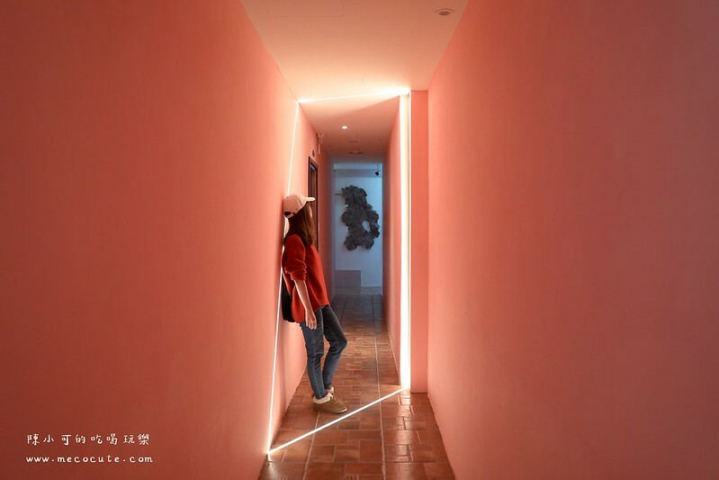 長型走道的牆面漆著粉色和藍色襯托,很有青春氣息。