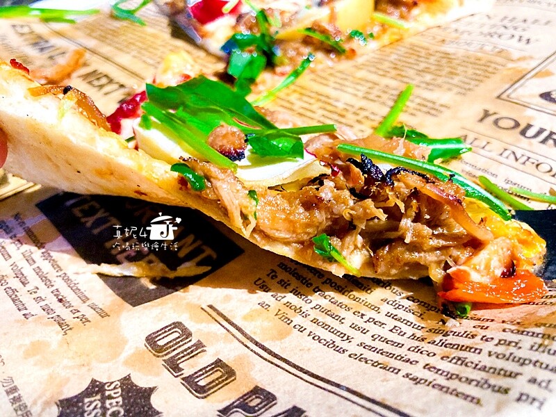 古拉爵是薄片比薩,餡裡的手撕豬肉份量超多,拿起的每一片比薩我都很小心怕把肉給掉了…