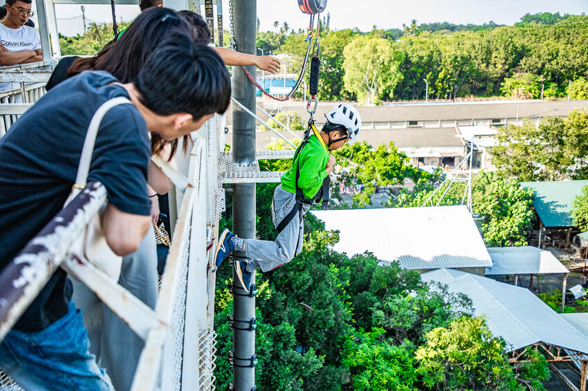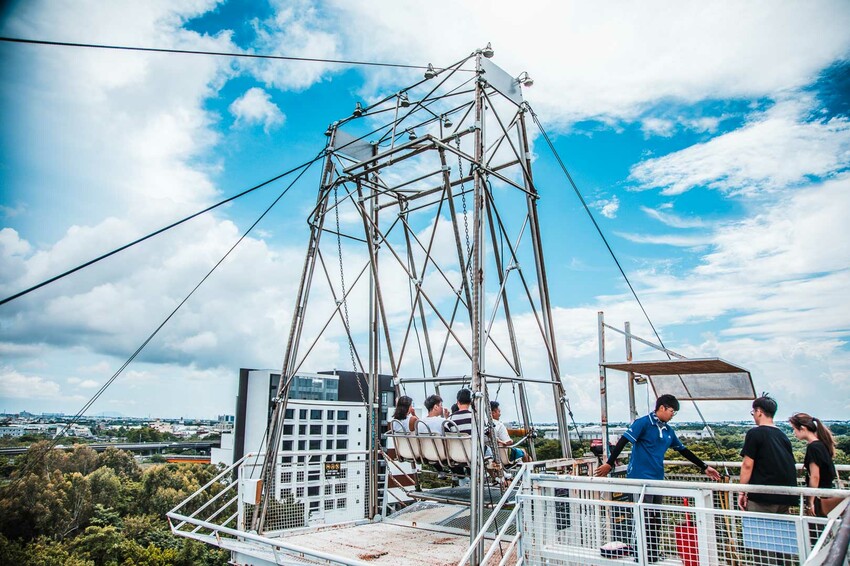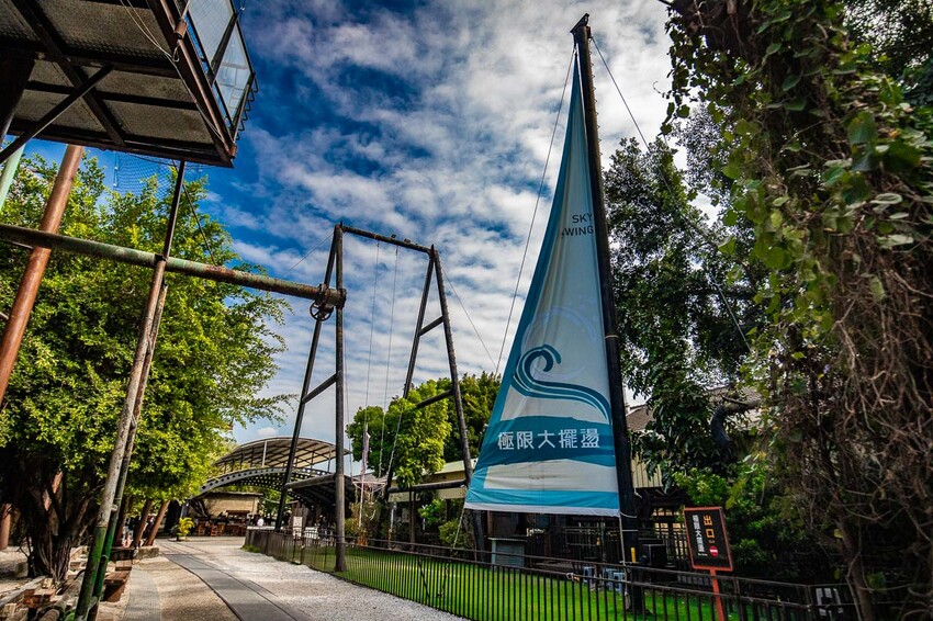 十鼓文創園區除了很多景點可以拍照外,且還有超多好玩的極限運動設施,而且還在陸續增建中,有許多刺激程度超高的遊樂設施,像是這個最新的極限大擺盪,高達5層樓,將旅客懸掛在半空中,接著宛如海盜船般突然掉落,接著在半空中以70度大幅度擺盪,超級刺激!