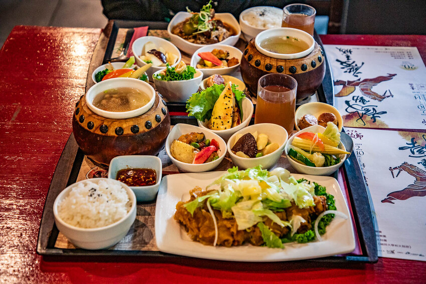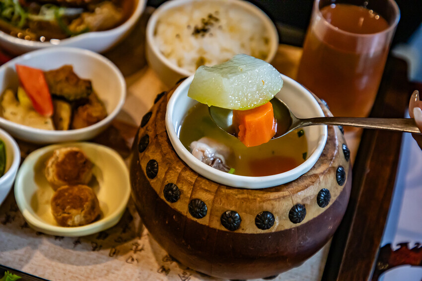 套餐料理非常豐盛,從前菜、沙拉、甜點、飲料、主餐、湯品都包含在內,而且盛裝湯品的容器是特製的鼓造型,十分符合十鼓的主題意象