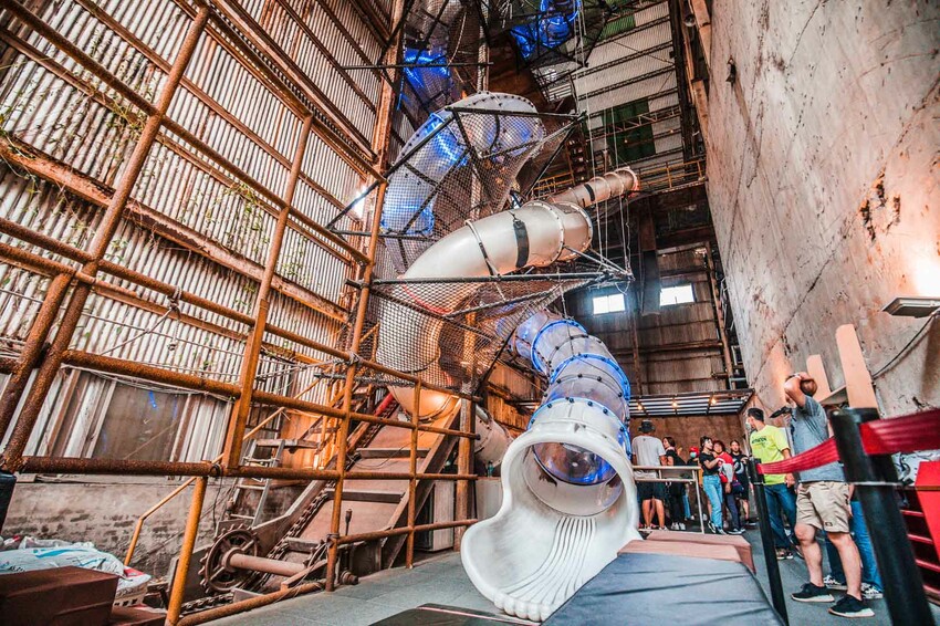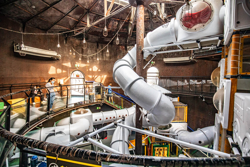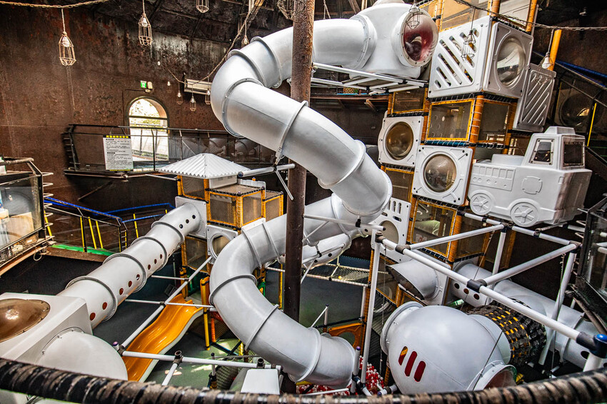 煙囪滑梯,五層樓的超高溜滑梯,而且這裡會讓您穿上助滑的裝備從上面滑下來大概不用五秒的時間,螺旋設計滑下來有點頭暈….