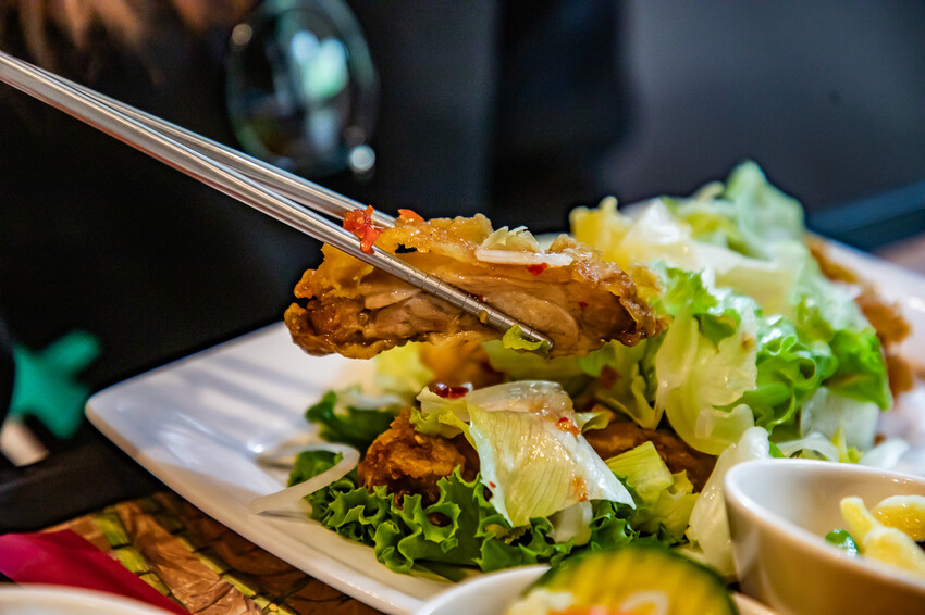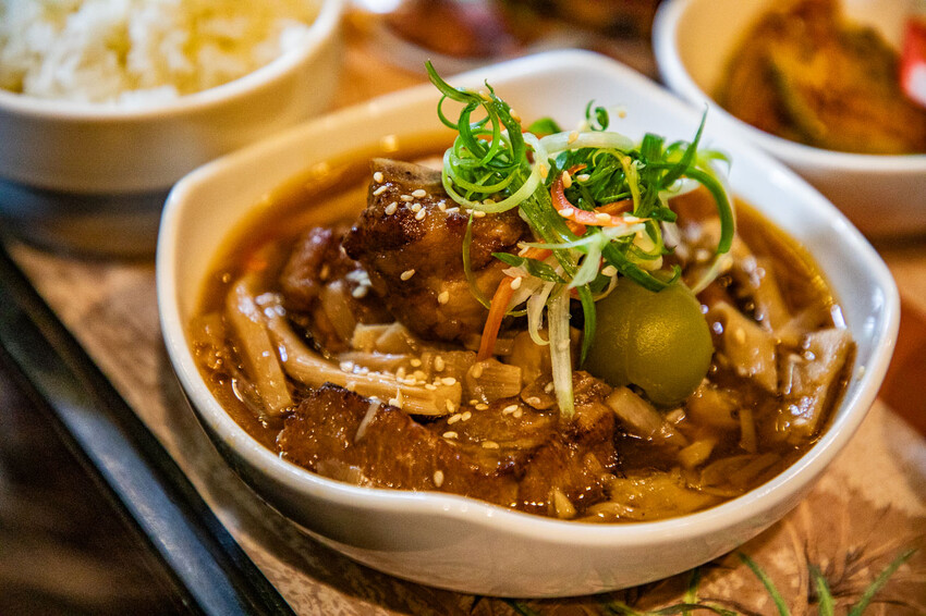 我們點了炊牛雞跟蔗香紫蘇豬小排,都是專業主廚製作,味道比起大餐廳一點都不輸,尤其我超愛蔗香紫蘇豬小排醬香濃郁非常下飯,裡面還有清甜的筍絲!炊牛雞是泰式椒麻雞,外酥內嫩,加上微辣的醬汁相當開胃