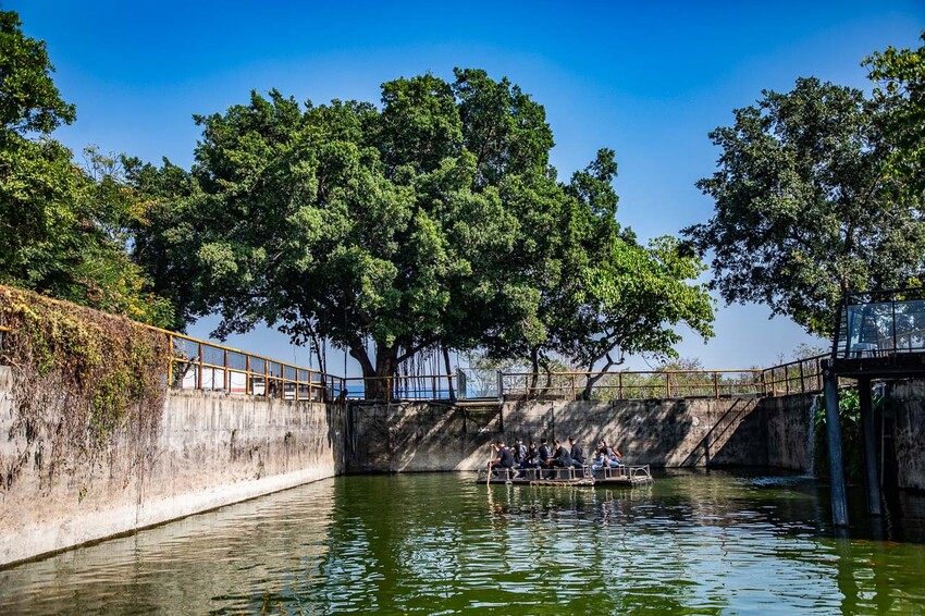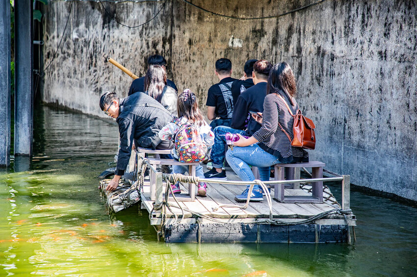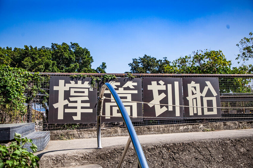 打完鼓可以再往後方走就可以看到撐篙划船,大水槽原是仁德糖廠的二號冷卻池,經改造後成為體驗古代撐篙划船樂趣的秘境,一艘竹筏搭載2~8人,前方二人撐篙,竹竿可直接抵到地面繞水塘一圈,可以讓大小朋友體驗撐篙划船的樂趣