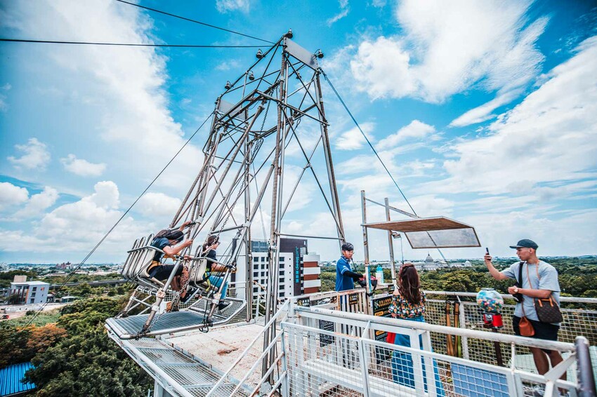 天堂上的鞦韆,天堂路走到盡頭就是天堂上的鞦韆,是十鼓文創園區2019年推出的高空刺激設施,最多可以五人同時搭乘,搭乘上天堂上的鞦韆可以享受在高空擺盪猶如飛鳥般的刺激感,而且也能一覽十鼓文創園區美景