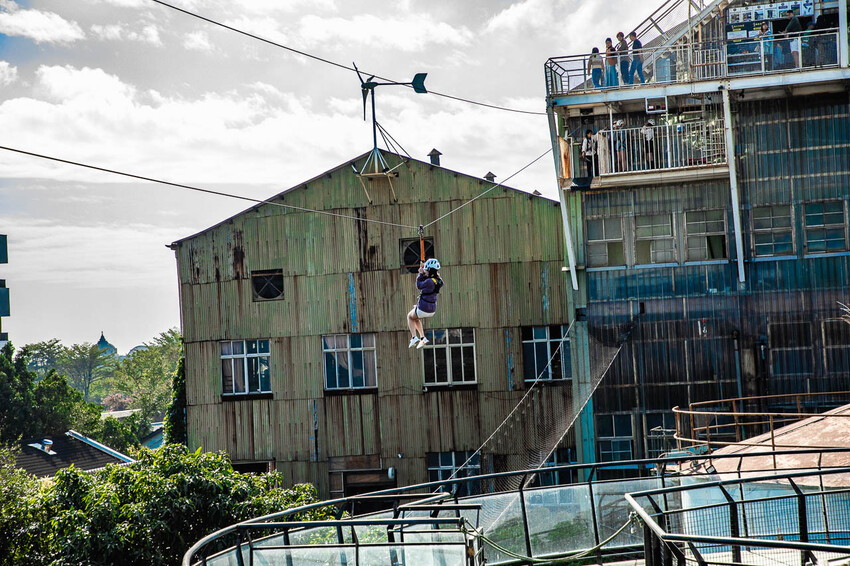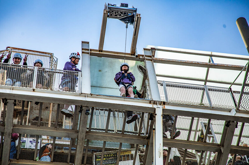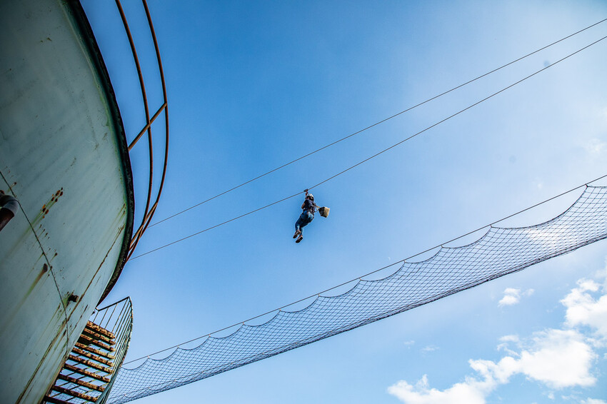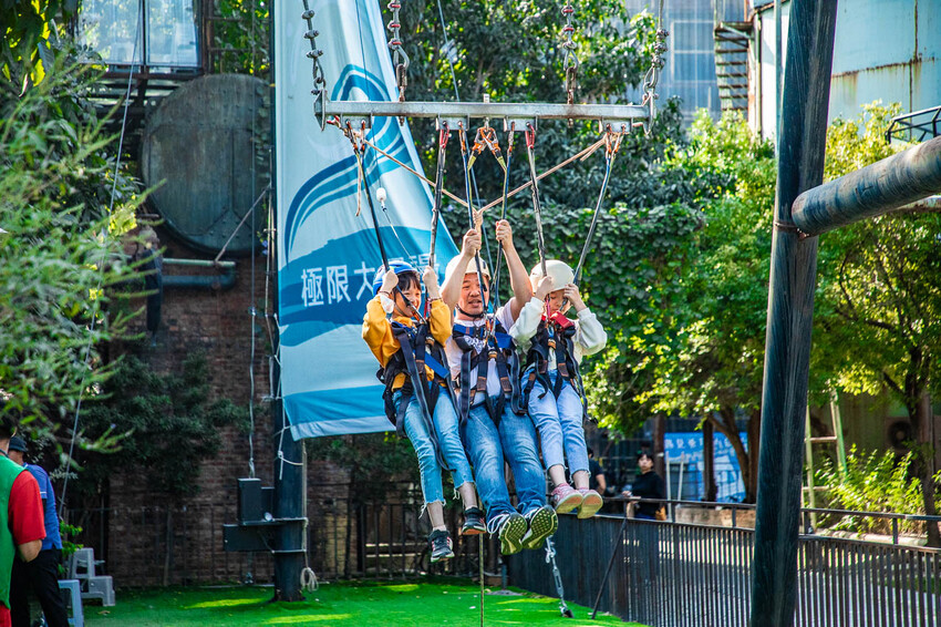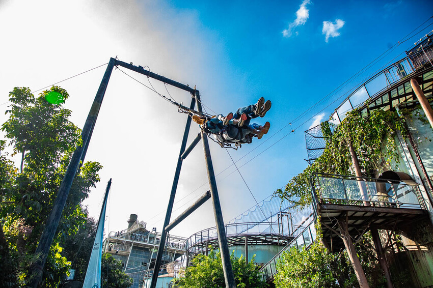 飛天宅急便,腳下懸空在20公尺高空飛行約10秒,同時橫跨整個園區,速度感加上漂浮在空中,猶如體驗老鷹翱翔般的快感!