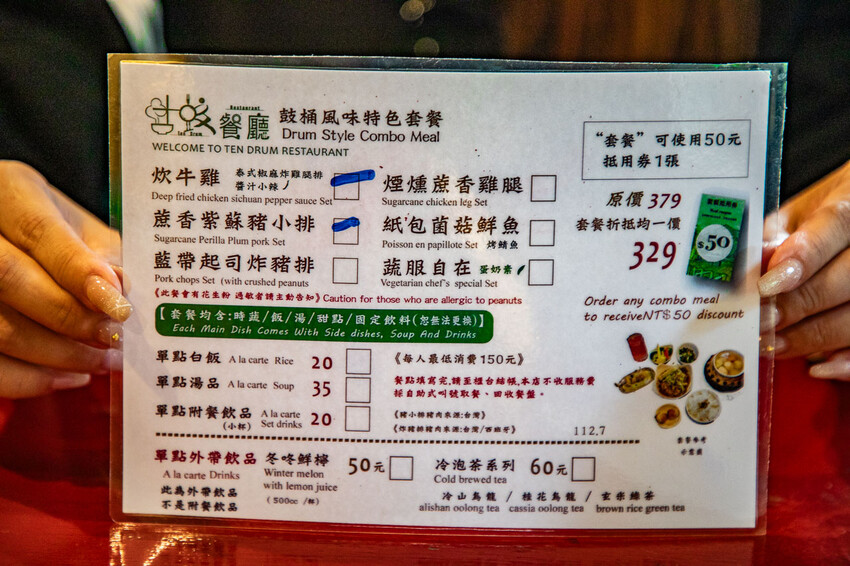 十鼓文創園區也有提供餐飲的服務,十鼓餐廳總共有6種套餐可以選擇,餐點料理品質也非常有水準,所以生意非常好,用餐時段都是滿座,整體價格落在$299~329之間,含一杯飲料