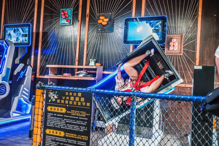 360度VR體驗館可以戴上VR眼鏡,感受非常有臨場感的刺激冒險遊戲,坐椅也會隨場景360度轉動加上音效聽覺感受,其實還蠻刺激的