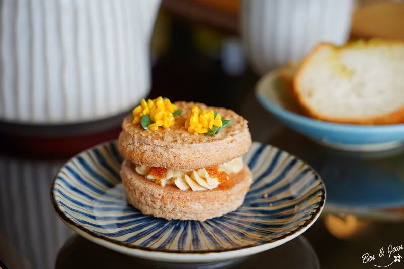 鬆軟可口的達克瓦茲也非常好吃!! 特別是中間的內餡竟然是一顆顆的飛魚卵耶
