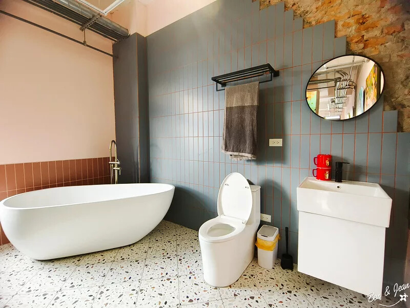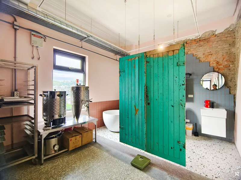 樓梯後方的空間也滿有意思的,除了釀酒設備外,後方還有浴缸呢