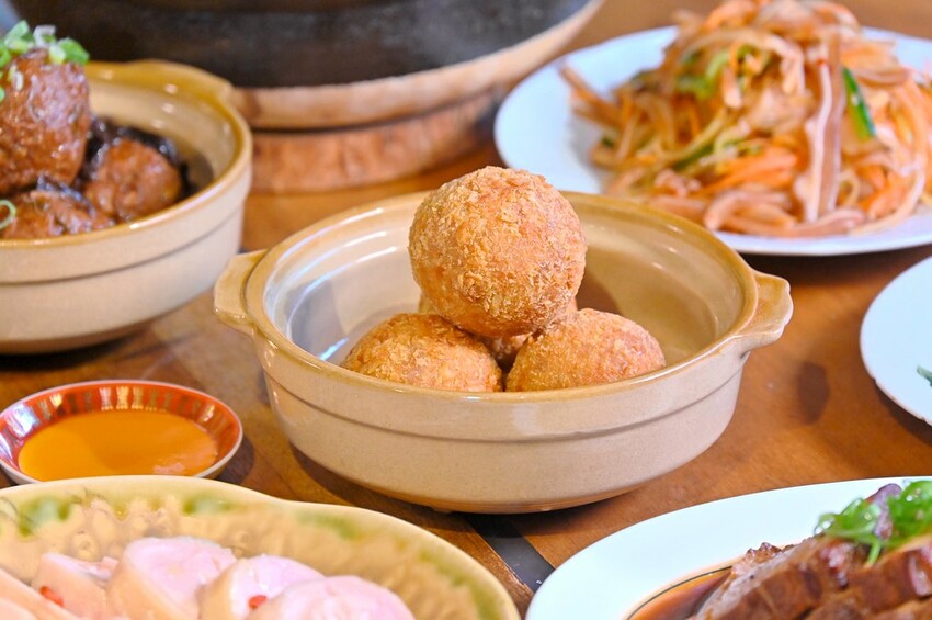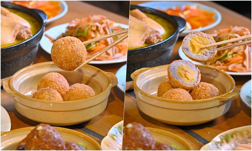 如果你有去過寧夏夜市應該會吃過一攤很夯的排隊芋泥球,綿密芋泥加上鹹香金沙蛋黃絕配!這道就是多少參考了這個老味道,但是在金沙調製上改良了自己想呈現的口味,整個尺寸還直接加大,以大甲芋頭來製作芋泥,中間是金沙內餡,油炸過後外表非常酥香,