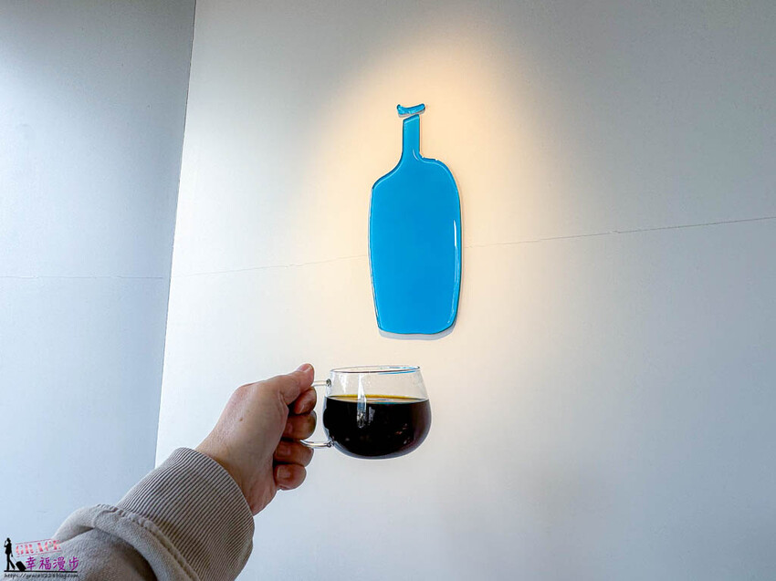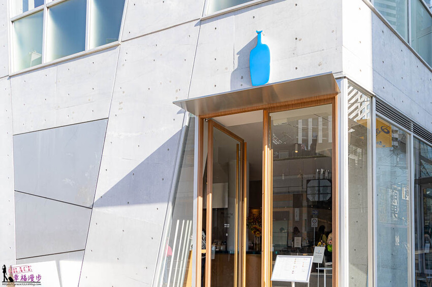 大門口的上方就有著藍色瓶子的標誌,也是藍瓶咖啡的招牌。