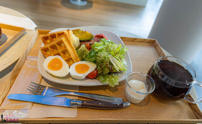 比利時鬆餅上面的鮮奶油滑順又不會太甜膩,鬆餅的口感比較紮實,沾點鮮奶油風味更佳,飲品的部分是哥倫比亞咖啡和蘋果汁。
