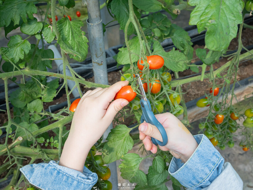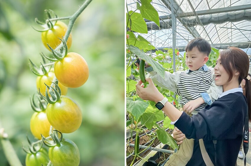 記得當我踏進溫室,就被環境這麼整潔的溫室震驚,這個蔬果種植的環境實在太舒適了,而且走道十分寬敞,即便是孩子們在裡面奔跑也沒有關係。園區以無毒栽種著各式水果和蔬菜,因採預約制,所以同時在園區的訪客不多,採果體驗的品質還不錯,比較有趣的是,園區有規劃一區用餐區/DIY區,只要提前預訂,就可以在這個漂亮的溫室裡用餐。