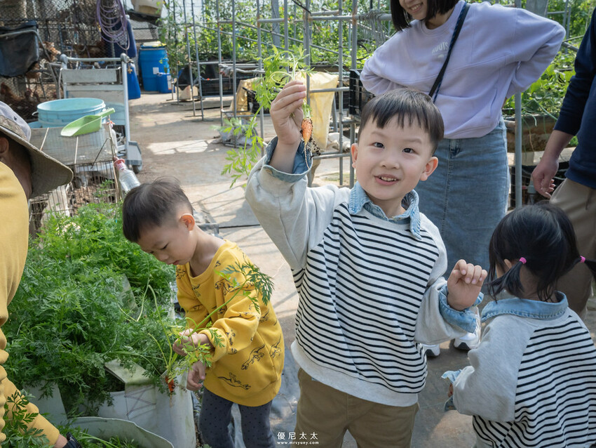 利河伯農場的另一項隱藏版活動是親自餵雞,但需要額外詢問老闆今天是否有這個活動可以參加。遊客可以拔取迷你紅蘿蔔,將紅蘿蔔的枝葉親手餵食給母雞,同時也能體驗到接觸動物的樂趣。老闆有特別介紹,這裡的雞舍是用益生菌養雞,所以沒有什麼味道,孩子們也比較願意和動物親近。